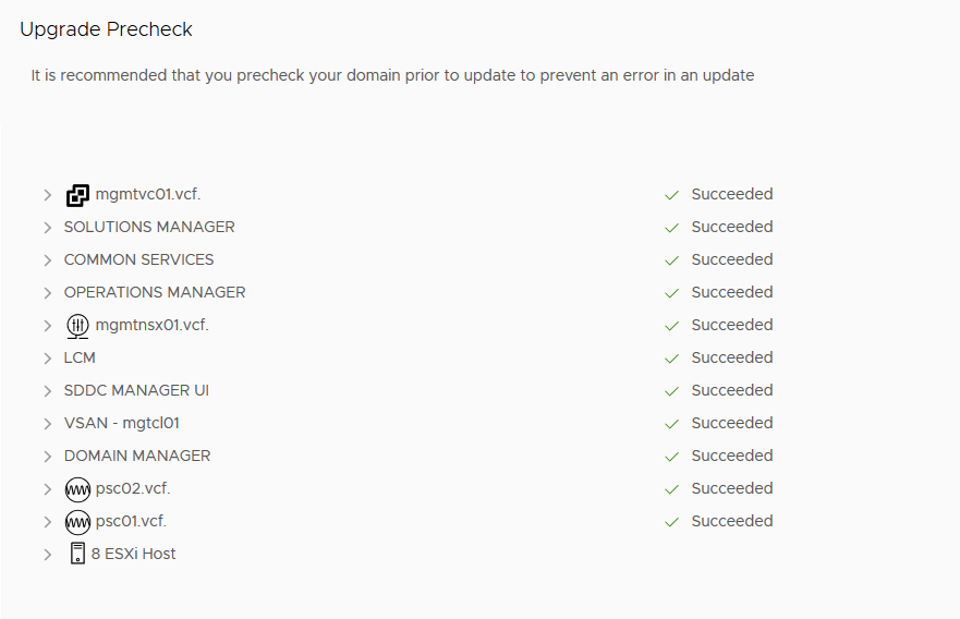 Before each VCF upgrade it’s important to always do the built-in pre-check from the SDDC manager. There you will learn about any discrepancies or issues that need to be addressed before you can safely execute the operation. But as any sysadmin knows, that’s not good enough. Below I’ll show you what other things I double (or triple) check before I hit the ‘upgrade now’ button.