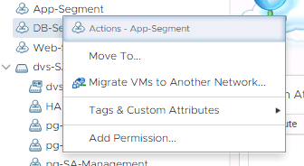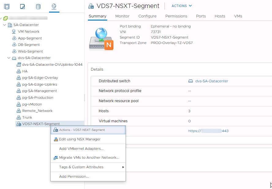 Portgroups for this switch can be either VLAN or NSX Distributed Portgroups. The latter are called segments and can only be managed through the NSX-T Manager, much like opaque switches. The context menu from the vSphere Client gives you a direct link to the NSX-T manager.