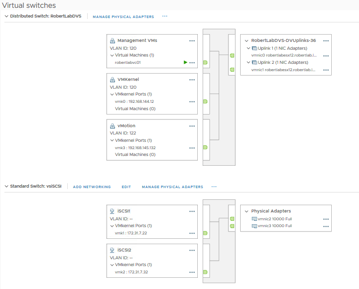 Each host has 4 “physical” uplinks (they’re nested ESXi, so physical is dubious). Two of the uplinks are allocated to the DVS. The other two are connected to a standard vSwitch (VSS) for the physical iSCSI storage (this really is a physical SAN).