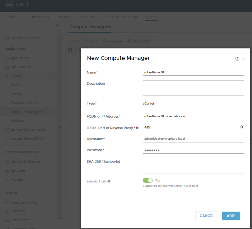 The Compute Manager is the vCenter you want to tie your NSX-T Manager to. Simply go to System -> Fabric -> Compute Managers and click ‘+ADD’. Next, fill in the vCenter details you want to connect to. Click ‘Enable Trust’, this enables a 2-way trust between vCenter and the NSX-T manager, used for Kubernetes.