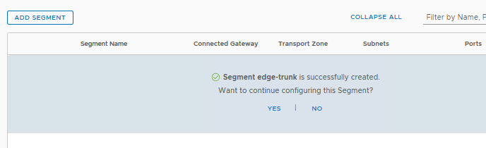 Before deploying gateways and Edge nodes we will need 2 segments. It may seem a bit the other way around, deploying segments before we have any network infrastructure, but these are part of the infrastructure.