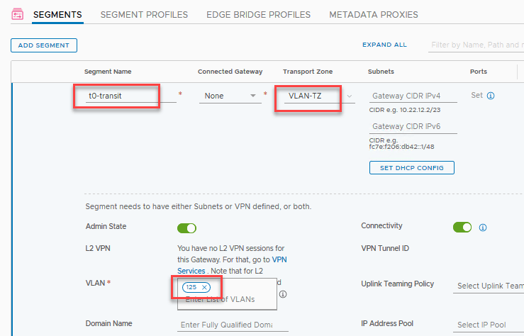 The other segment we need is our T0 transit segment. Click ‘add segment’ once more and fill in the details. I will connect this T0 to a transit network that is tagged with VLAN 125, so I will add that here.