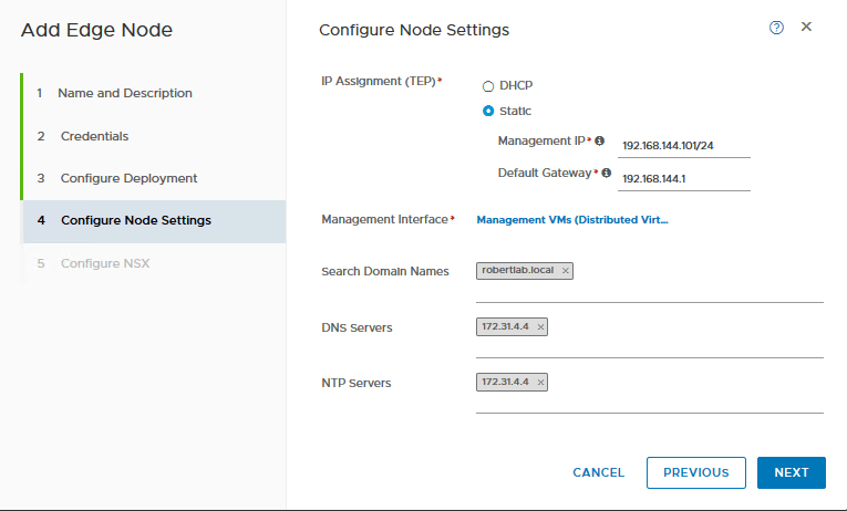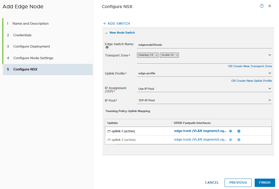 And finally we configure the N-VDS. Now I can hear you thinking ‘but we’re using VDS7 so that we wouldn’t need the N-VDS’! Yes, but no. The N-VDS we configure here is internal to the Edge node, it won’t show up in vCenter. Since the edge nodes have their own TEPs, they need the N-VDS.