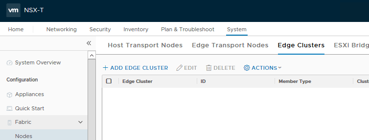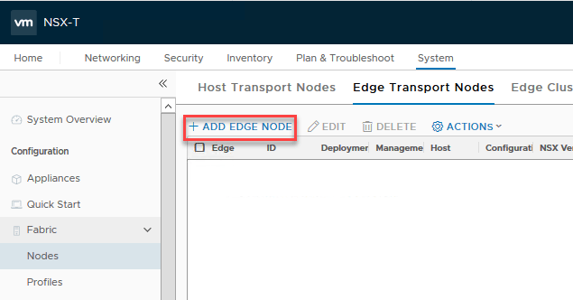 I will deploy 2 Edge nodes so that I can create an active-passive T0 setup below. First, the nodes: go to ‘System’ – ‘Nodes’ – ‘Edge Transport Nodes’ and click ‘+ADD EDGE NODE’