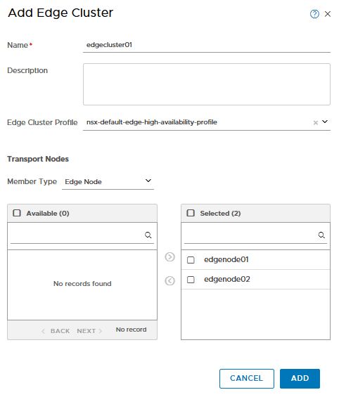 Go to the ‘Edge Clusters’ tab and click ‘+ADD EDGE CLUSTER’