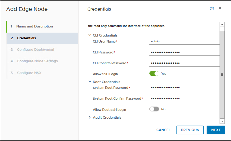 Next we create passwords for the ‘admin’ and ‘root’ users. I’d like to SSH using ‘admin’, so enable that. I’m not using the optional ‘audit’ user so I’ll skip that.