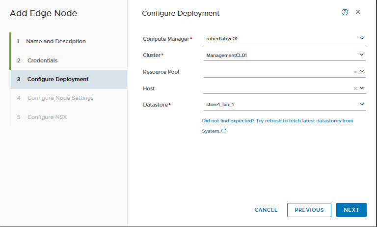 Specify where we want to deploy it; the vCenter, our management cluster, and the datastore.