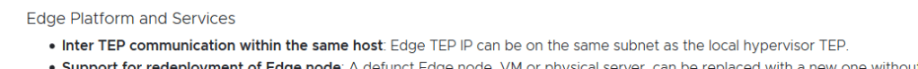 In NSX-T 3.1 we can have the Edge TEP in the same subnet as the ESXi host TEP, which simplifies our deployment. Now we can have simply a TEP network, rather than seperating them in ESXi host TEP and Edge TEPs. Nice! But for that to work we need to connect the Edges to an NSX-T segment. I found out first hand that having a VDS portgroup does not work. Luckily I found this excellent post which talks about that (thank you, Shank!).