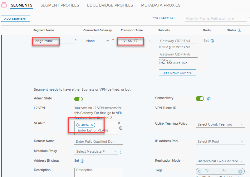 The segments we need are the transit network for the T0 gateway, and a trunk for the Edges. Especially this last one is interesting, because that fixed a big issue for me. The reason is the following: