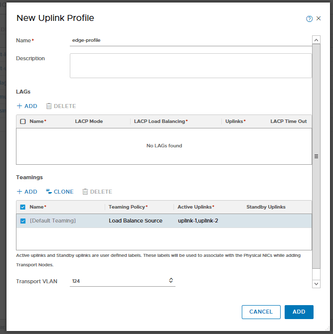Again? We already did this! Yes, but we will create a seperate one for the Edge uplinks. To be fair, for this setup it will be the exact same profile. But from experience I can tell you that you should always create a profile for one specific purpose. Should you need to change anything in the future, it will only affect that specific part, not the entire environment. The VLAN here is the one for all the TEPs.
