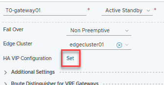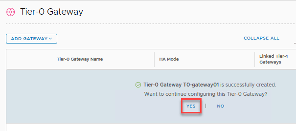 Another option that we can use with active-standby is the HA VIP configuation. It becomes visible afer saving. Now, we click ‘yes’ when asked if we want to continue configuring this Tier-0 Gateway!