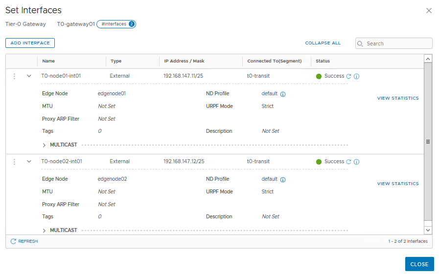 First, we have to configure the interfaces. Since we’re technically deploying two T0-gateways – one on each edge node – we need to configure two interfaces as well.