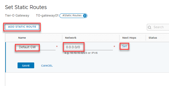 We do need to set a static route as a default gateway on the T0, so that traffic can find its way out. Go to the ‘Routing’ section and click ‘Set’ next to ‘Static Routes’.