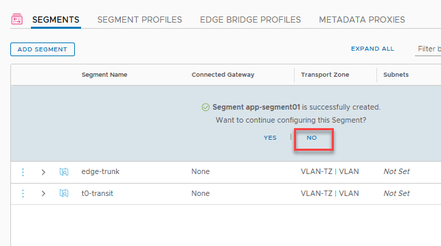 And the final part of our NSX-T endeavor; the NSX-T segments where our VMs will be connected. Go to the ‘Networking’ tab, ‘Segments’ and click ‘Add Segment’.
