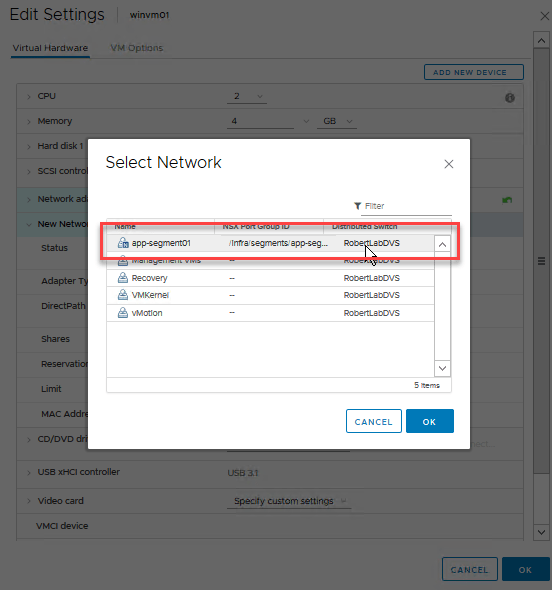 And now we have a segment we can connect our VMs to! It simply shows up as a regular portgroup inside of vCenter, so if we head over there and edit our VM’s network settings, we can click this segment to attach it.